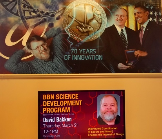 · Seminar announcement at BBN in 2019 for my seminar, Distributed Coordination (IF Secure and Smart) Enables the Internet of Things. The guy on the left is Ray Tomlinson, who wrote the first inter-computer email program, decided on the ‘@’ convention for email addresses, and sent the first email message in 1971; his office was just down the hall from mine. Then is Ed Campbell, who was my department manager at BBN and in this picture was then CEO of BBN. Finally, there is some unknown skinny guy from South Chicago who reportedly enjoys pickup hoops games. Below them is some ugly guy who probably broke the camera and caused people to lose their lunch when they saw this announcement monitor in the cafeteria; as of early 2025, this rogue researcher has somehow avoided tort claims for this vomitus.