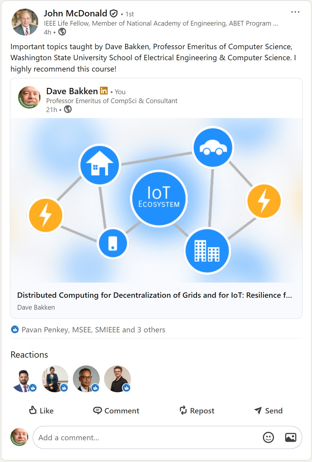 I offer a day-long training class, Distributed Computing for Decentralization of Grids and for IoT: Resilience for Agents, RAS and Prosumers (flyer: US Letter, A4). I am honored to report that John McDonald, former President of the IEEE Power & Energy Society, has reposted my announcement for my course, with a strong recommendation (LinkedIn, jpeg).